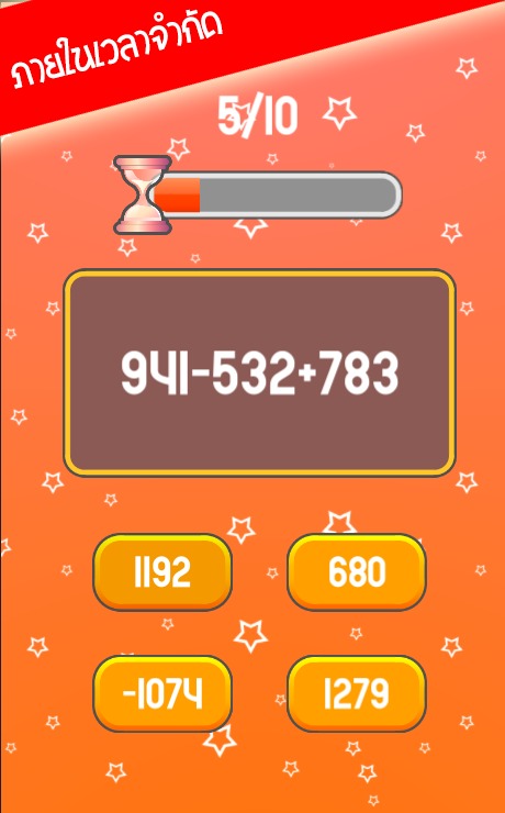 - โจทย์คิดเลขเร็ว บวก ลบHigh speed calculator, subtract the lightning puzzle game using the calculator, simply by using the plus-minus in the game with all 18 levels of difficulty will increase. The game even has a special calculator soon. Challenge Mode Is a measure of sensitivity and limit yourself. You can also view our scores with others through leaderboards.