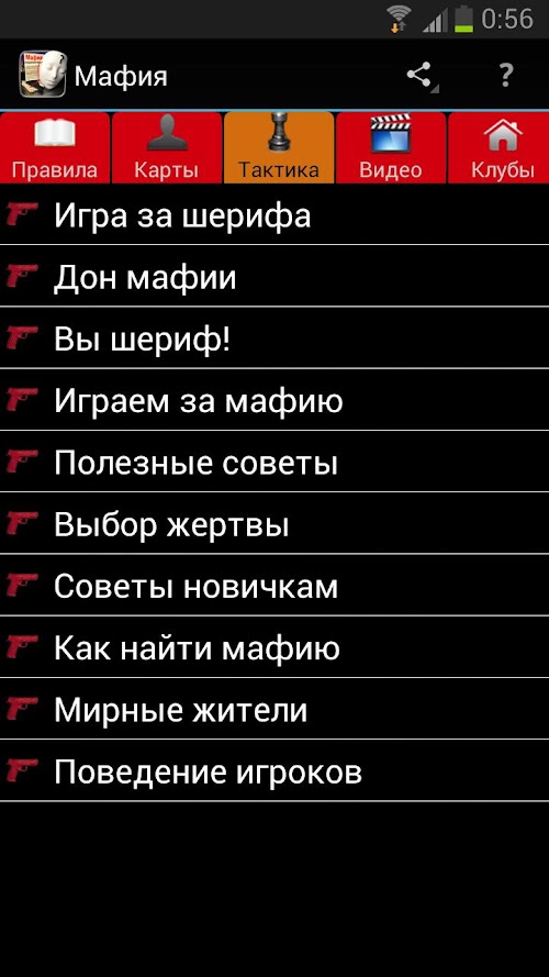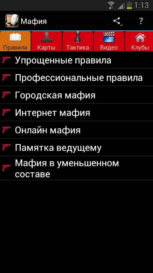 The application is a guide to the game of Mafia. Using this application you can see the different variations of the rules of the game, read the information about the game character, learn the secrets of successful game in the tactics, play the video games with a record of experienced players. For those who want to play mafia developed section Clubs