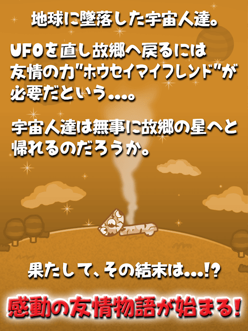 UFOを修理して故郷の星へ戻るには、友情パワー"ホウセイマイフレンド"が必要だという。