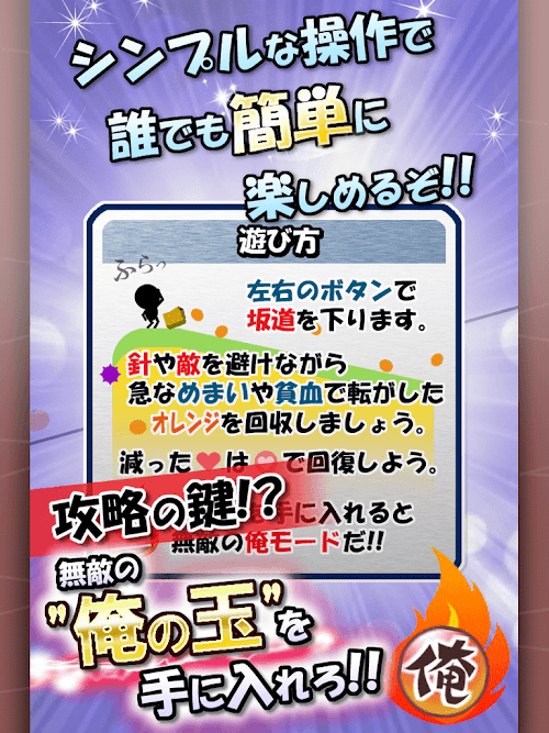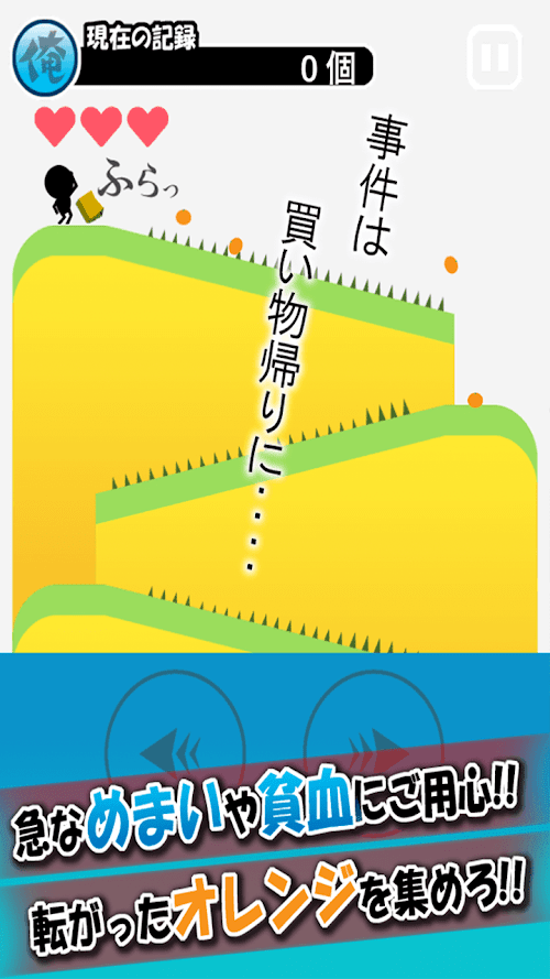 ボタンを操作して、坂道を下りながら転がったオレンジを回収しよう。
