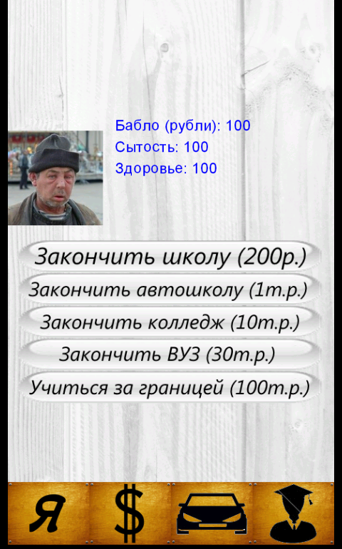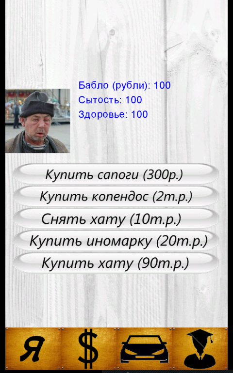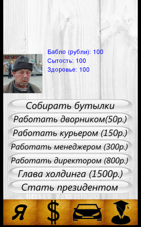 Simulator text and operated virtual buttons. The victory comes in the case of becoming president. Defeat if over health, satiety or money.