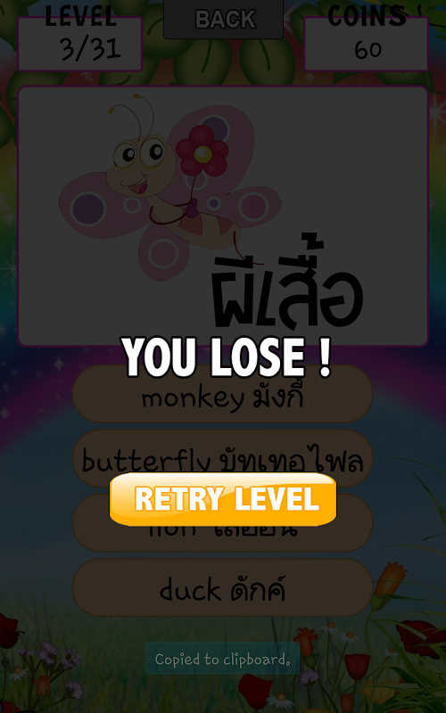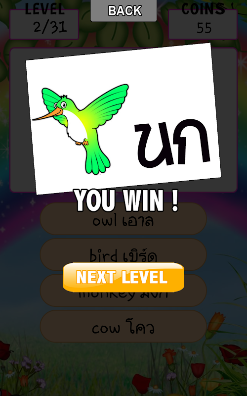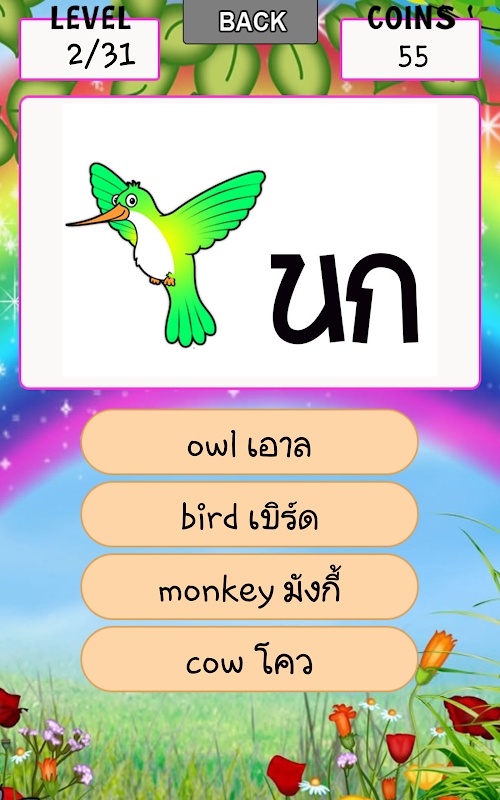 เกมส์เรียนรู้คำศัพท์ที่ไม่ยากเกินไป เหมาะสำหรับทุกเพศทุกวัย ในเกมส์จะได้พบกับภาพสัตว์ต่างๆมากมายหลายชนิด ให้ผู้เล่นคลิกคำตอบที่ถูกต้องLearning vocabulary is not too difficult. Suitable for all ages The game will meet many animal species. The player clicks on the correct answer.