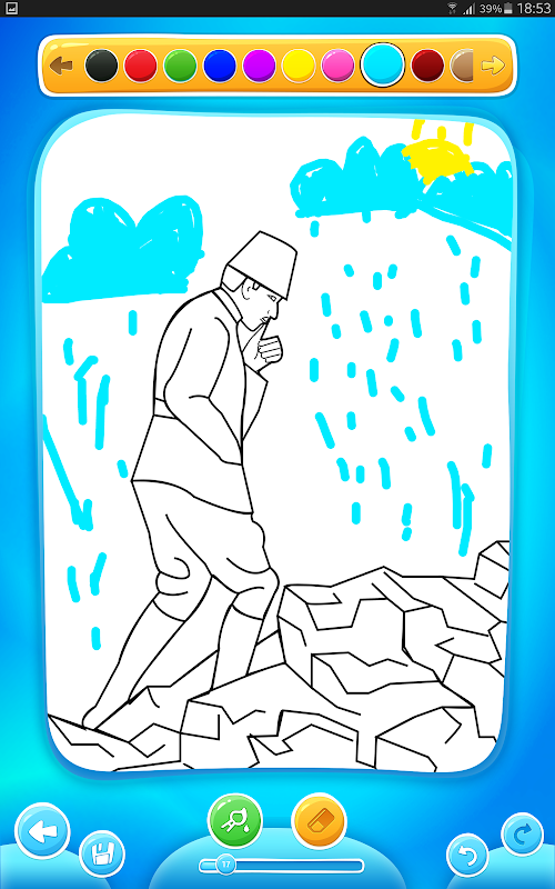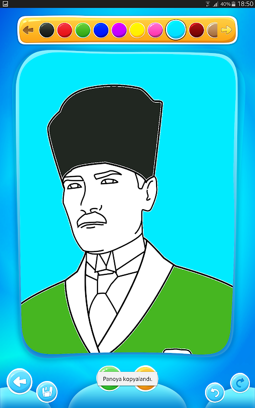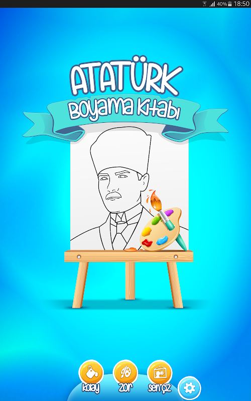 Atatürk Boyama Kitabı ile hem resim yapma yeteneğinizi geliştirin hem de Ulu Önder Atatürk'ü daha iyi tanıyın!Ataturk coloring book 10 different brushes and make 24 different pictures of important moments in the history of the Republic of color, you can learn more about Ataturk. If you want to make a picture with more colors simply invite your friends from Facebook!