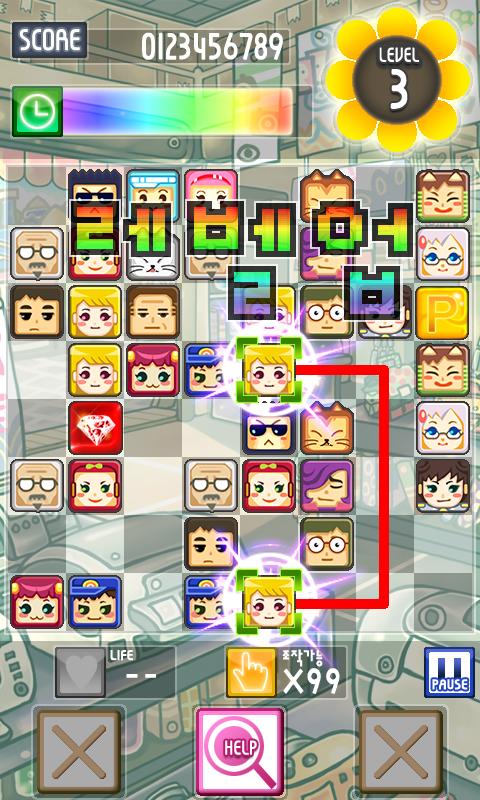 화면상에 보이는 2개의 같은 블록을 찾아 막히지 않고 2번 꺽은 선으로 연결해서 없애는 게임입니다.