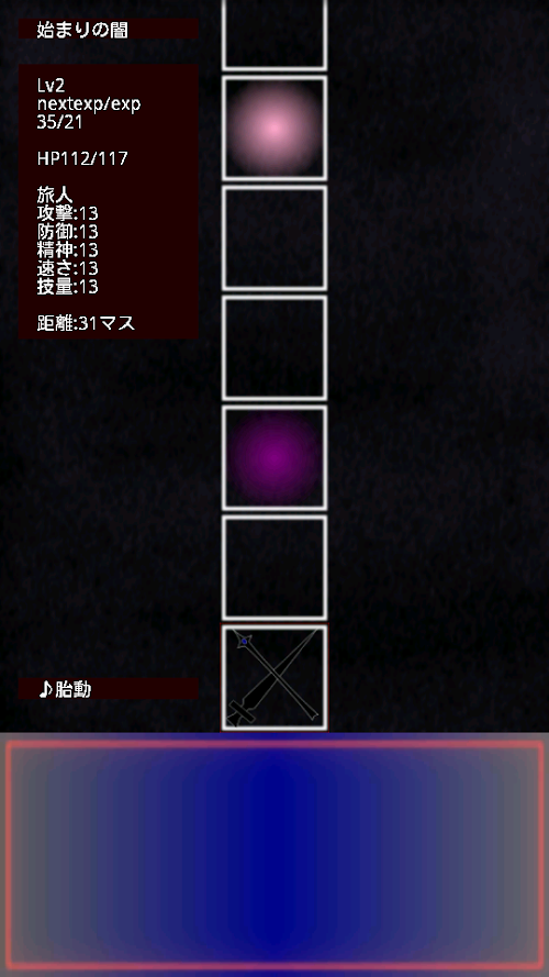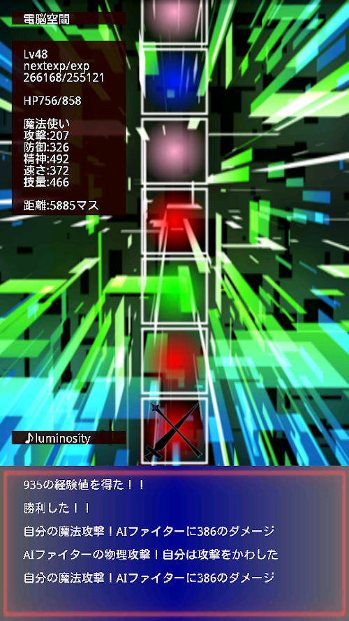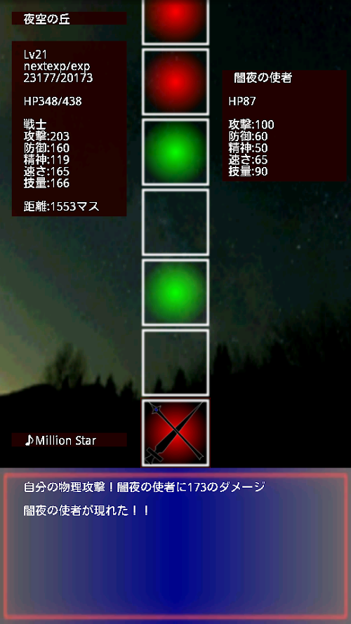 自動戦闘、タップをすれば戦闘が進みます。勝っても負けても経験値獲得可、負けた場合はペナルティーとして100マス戻されます。攻撃時は物理攻撃か魔法攻撃でダメージの大きい方を自動的に選択します。
