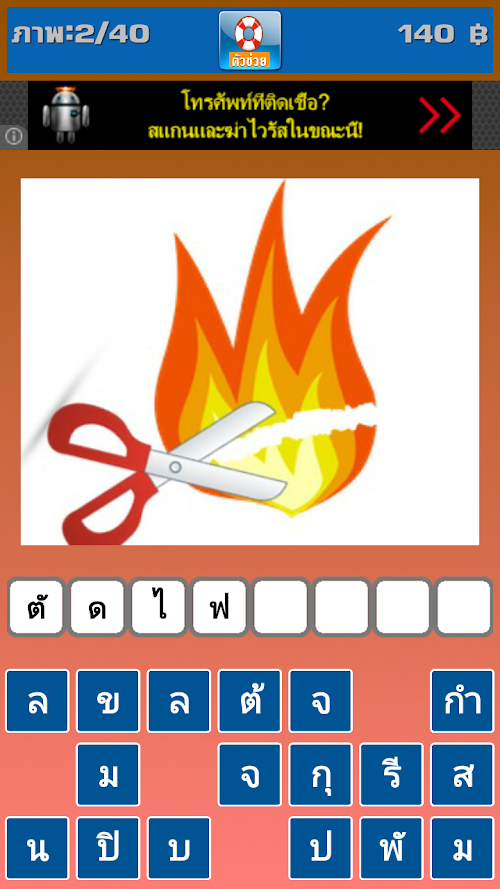 วิธีเล่นง่ายๆ ดูภาพปริศนาที่ให้แล้วกดปุ่มตัวอักษรด้านล่าง เพื่อนำตัวอักษรต่างๆไปเติมประโยคในช่องว่างๆด้านบนให้ครบ ถ้ากดผิด หรือไม่ถูก ก็กดตรงช่องนั้นๆ เพื่อยกเลิกGame guess words from a photo. The new version has been updated to play all the new games. Riddle guessing words from the letters in the correct sequence.
