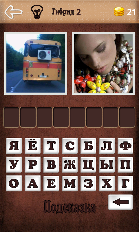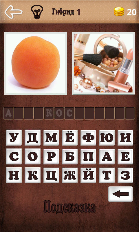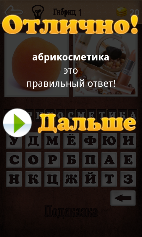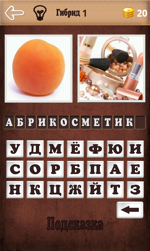 Rules of the game: in the job - two pictures - one word guessing, and the second begins on the same three letters, which ends the first. Tying words, as in the example and obtain a hybrid. The problem seems very simple, but it is only at first glance. Try to play and find out why the game makes you think.