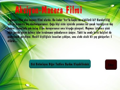 Hiç düşündünüz mü, hayatınız ne tür bir film olurdu? Nasıl biri olduğumuz, sürdüğümüz hayatın “tema”sını etkilemez mi? Kader senaryo olsa, hayatımız belkide çok ilginç bir film olurdu ? Test edin, görün! Have you ever thought, what kind of movie would your life? How we are one, we take life's "theme" s does not affect you? Fate scenario, though maybe our lives would be a very interesting film? Test it and see!