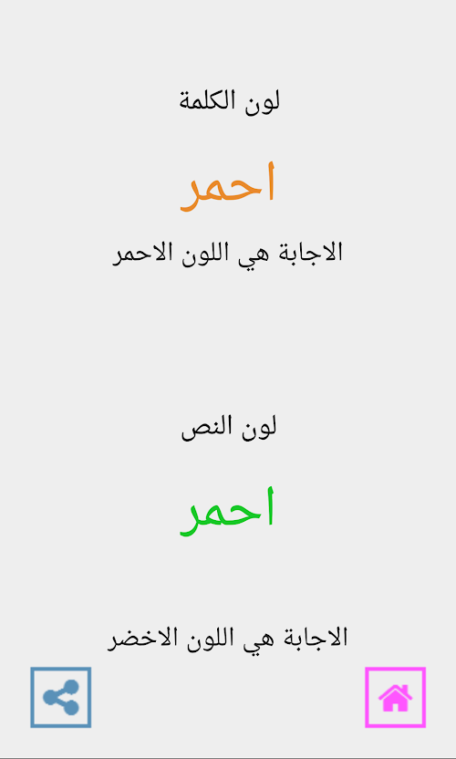 تعرض اللعبة عليك سؤال " لون الكلمة " و تظهر على الشاشة جملة مكونة من كلمة احمر و لكن الجملة بلون ازرق ! و المطلوب ان تختار اللون المشابة للون الكلمة و هو الاحمر.