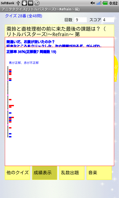 クイズの成績をファイルに保存でき、各設問の正解状況を表示することもできます!