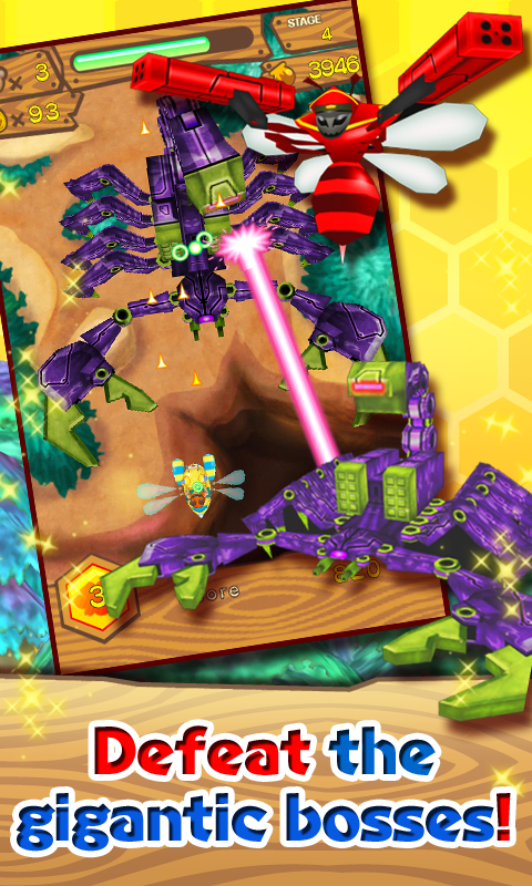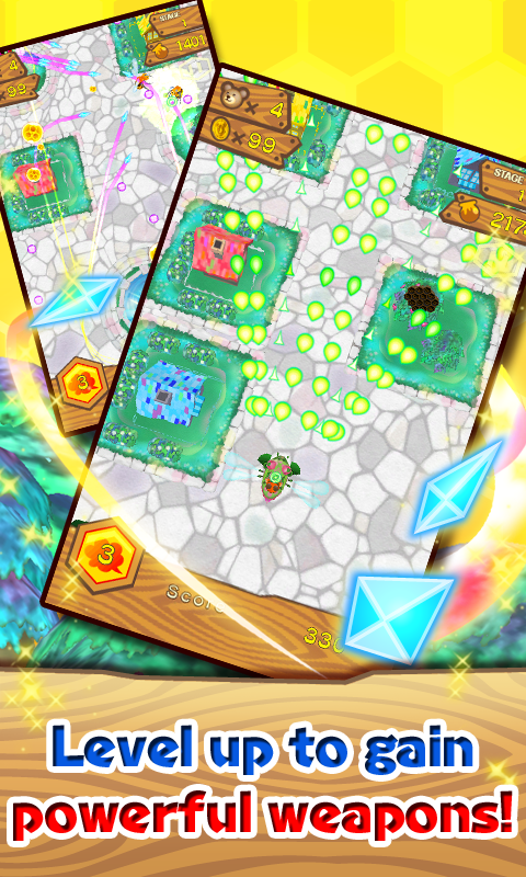 Collect honey by defeating enemies and use it to level up, so you can challenge bigger and stronger bosses!