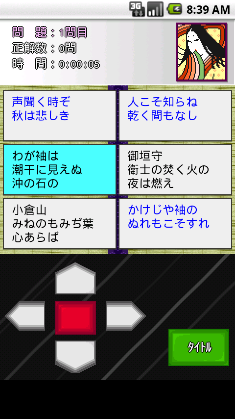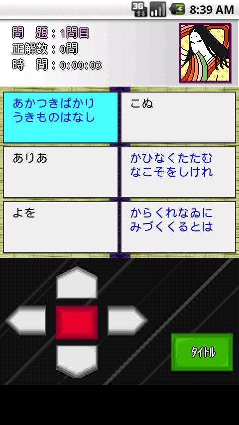 百人一首を全然知らない場合、正解は難しいかも知れません。This is the game to match the Kaminoku and Shimonoku of Hyakunin.