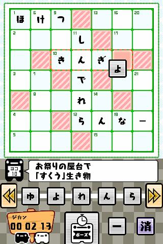 マス目に入れたい文字は、画面下のパネルから選んで1文字ずつ指で回答マスに移動して下さい。クリアタイムが早いほど高得点が出るよ。全30面をクリアしてユーザーとランキングを競ってみよう!
