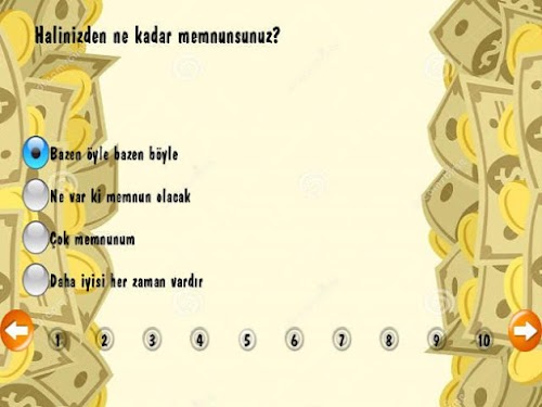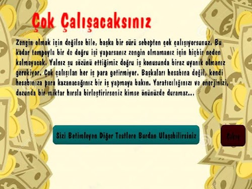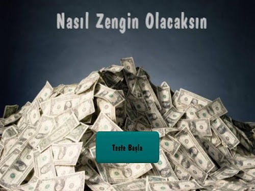 Hadi, hadi istemem demeyin ki biz de yan cebinize koymayalım. Kim istemez para meselelerini daha az düşünmek zorunda kalacağı kadar zengin olmak. Hatta çoğumuz daha fazlasını da isteriz. Ama zenginliğin nasıl olup da bizi bulacağını bilemeyiz. Yolunu mu şaşırsa acaba, aklını mı uçursa da para bizi bulsa... Testin sonunda muhtemel zenginlik kaynağınız hakkında bir fikriniz olacak. Ama biliyorsunuz hiçbir şeyi garanti etmiyor, yalnızca eğleniyoruz... Come on, come on, do not say we do not want the side Let's not your pocket. Who does not want less money issues to be rich enough to be forced to think. Even more than most of us would want. But riches do not know is how to find us. Do you wonder if you squint your way, your mind finds us money in the end ... If the end of the test you will have an idea about the possible source of wealth. But you know, it does not guarantee anything, we're just having fun ...