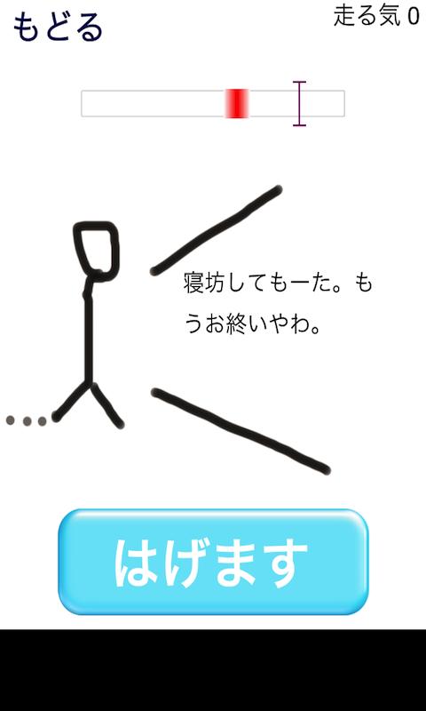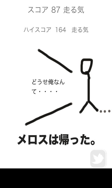 「今日のメロスはどうもやる気がなく、愚痴と言い訳ばかりです。しかも関西弁。タイミングよく励まして、やる気が出るとメロスは走るようです。」