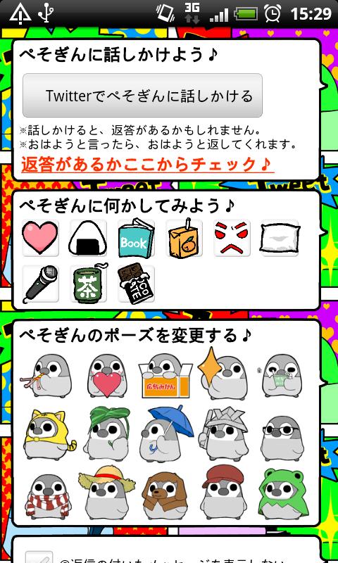 本アプリはウィジェットです。 ホーム画面に本ウィジェットを設置してください。 ぺそぎん部分をタップする事で、ぺそぎんのポーズ変更、何かしらのアクション、ツイッターを介した話しかけが出来ます。