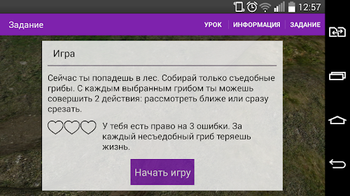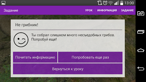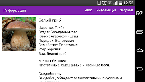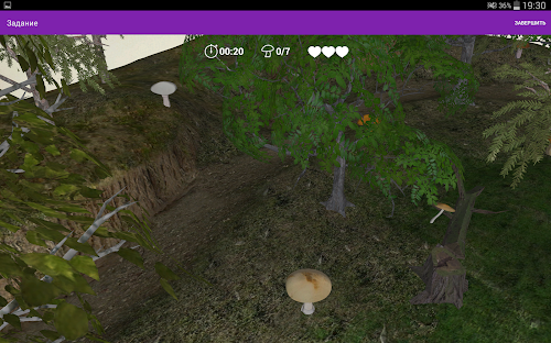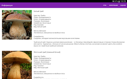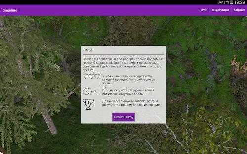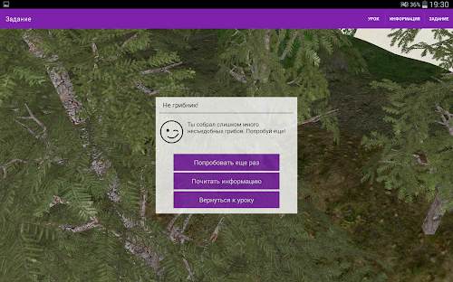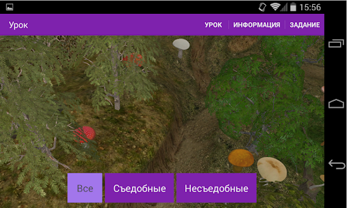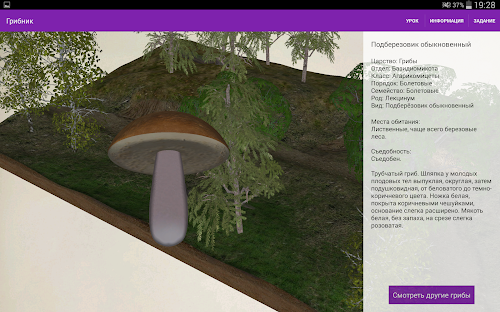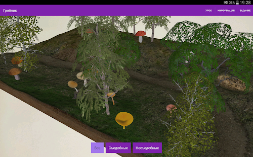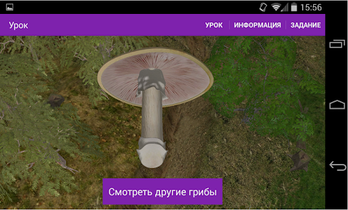 1. Урок. Позволяет изучить в режиме дополненной реальности 11 грибов (белый гриб, желчный гриб (белый ложный), бледная поганка, шампиньон обыкновенный, опенок осенний, опенок ложный серно-желтый, подберезовик обыкновенный, подосиновик красный, лисичка обыкновенная, волнушка розовая, мухомор красный), размещенных в характерной для них среде обитания. Каждый гриб можно рассматривать детально (поворот, масштабирование, перемещение), читать о нем информационную справку.