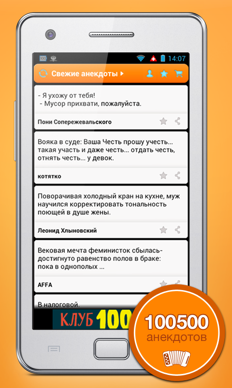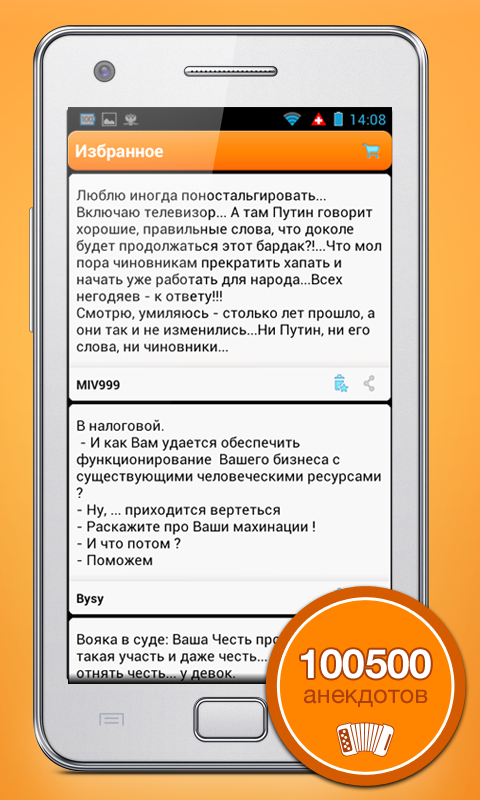 Отличное приложение для того, чтобы развлечь себя в дороге, в очередях или на свободной пятиминутке, где время тянется очень медленно. Но еще приятнее собирать свою избранную коллекцию анекдотов и делиться ею с друзьями через социальные сети."Anecdotes of Russia" - the largest collection of humorous, the first daily updated resource in the Russian Internet. Every day there are new issues of anecdotes, stories, aphorisms and poems. In 15 years of existence in the archives collected nearly a million texts.