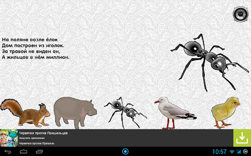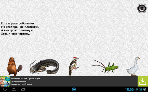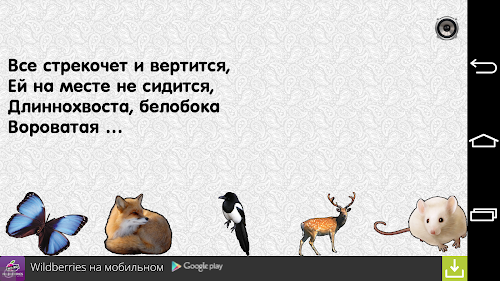 Все птицы, рыбы, насекомые и животные в приложении хорошо узнаваемы ребенком, так что особых сложностей возникнуть не должно. Хотите развлечь ребенка, показать ему что-то новое и интересное? Тогда «Загадки о животных» - это то, что нужно!Cognitive app "Mysteries of Animals" - a collection of more than 100 different poetic riddles about animal mire.Zagadki about animals help your child not only to broaden my horizons, but also learn a lot of new information about the animals, birds, fish and insects.