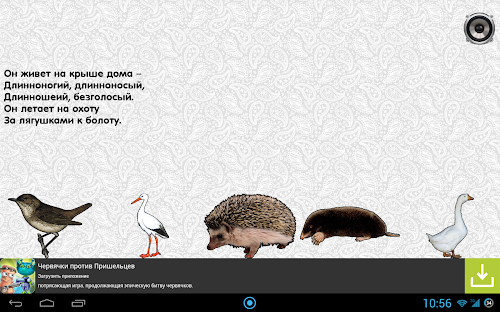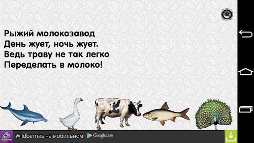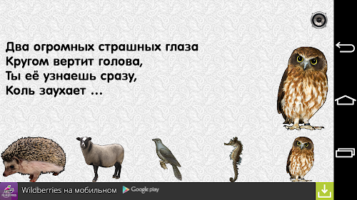 Чем хороша загадка? Она дает возможность мыслить логически, сопоставлять описания и в результате – верный ответ! Чтобы ребенку было легче ориентироваться, на экране рядом с текстом загадки расположены несколько картинок-отгадок, одна из которых верная. Каждая загадка озвучивается, как и ответ. В приложении нет уровней, загадки появляются в результате свободной выборки. А чтобы было еще интересней – о каждом животном есть несколько разных загадок!