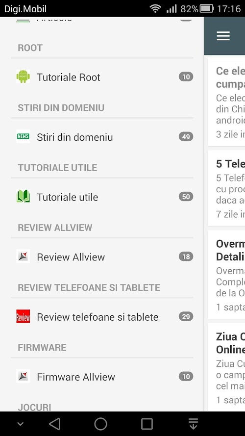 Prin intermediul aplicatiei ai acces la o parte din tutorialele, recenziile de jocuri, aplicatii sau de telefoane si tablete iar pentru a descoperi tot continutul, poti accesa versiunea completa a siteului direct din aplicatie. In aplicatie sunt incluse si sectiuni precum root Allview sau actualizari firmware Allview si pentru a avea acces la tutorialele de root sau actualizarile de firmware pentru majoritatea dispozitivelor, te invit sa vizitezi site-ul.