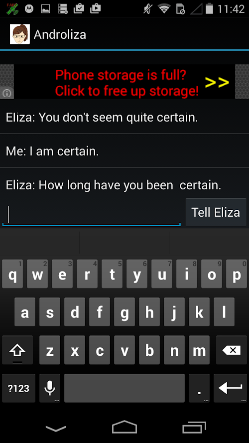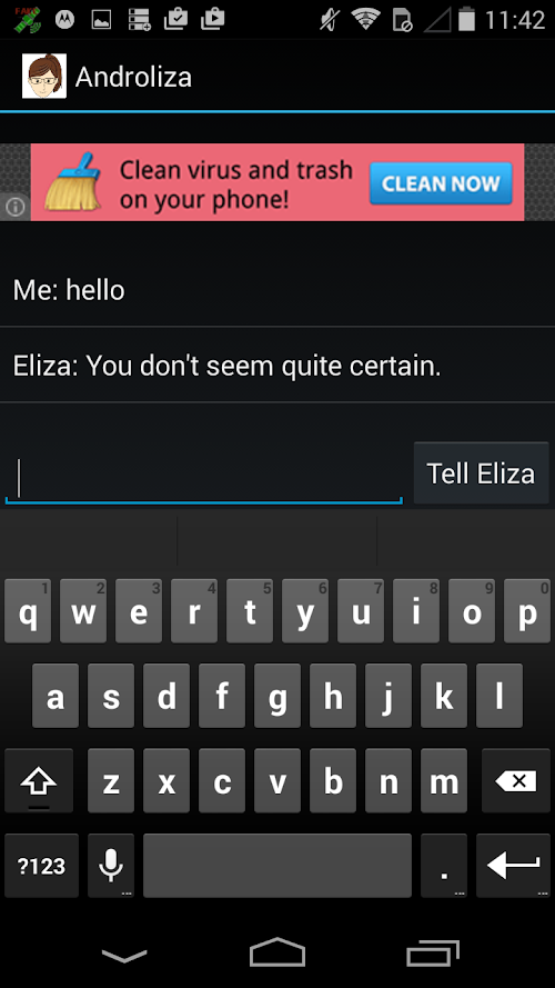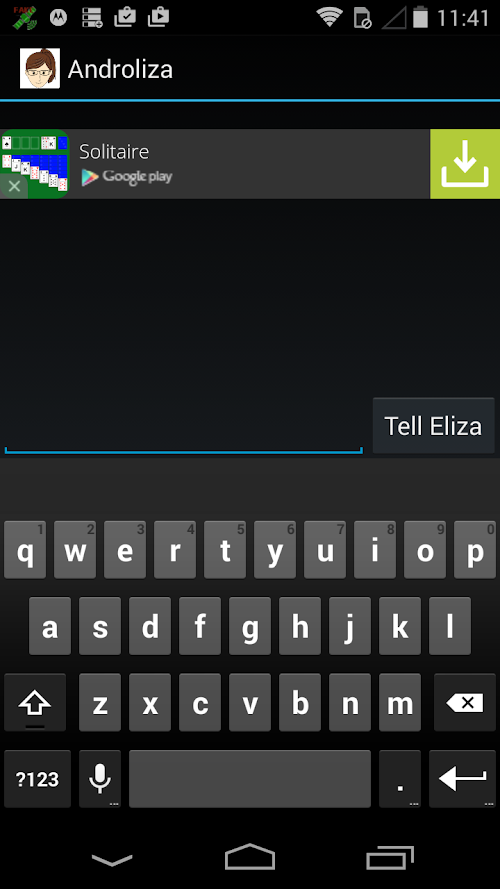 Based on the classic game "Eliza", Androliza will answer your questions all day long, helping you to ponder the great mysteries of the world.