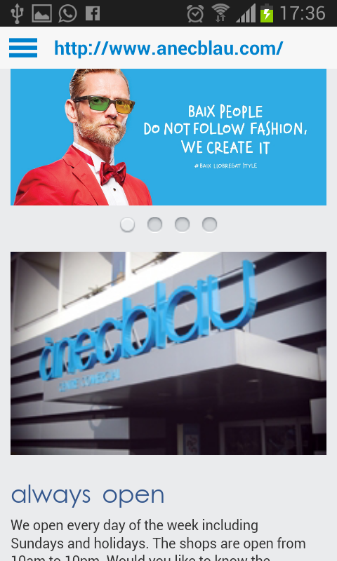 ANECBLAU is the mall open on Sundays in Castelldefels Barcelona. We have a funny name and an open mind. So we are the only shopping center in Baix Llobregat mall open 7 days a week, including Sundays and holidays, from 10 to 22h. In our shopping center of 30,000 m2 you will find all kinds of shops with a wide variety of fashion, accessories, gift items, appliances, market, restaurants, 9 cinemas and free anecblau parking: try the feature in app - Where is my car?. We are an open center, we like things happen, movement, new experiences. So constantly we renew and expand our commercial offering, develop new exclusive promotional offers for our clients (Try tarjeta)