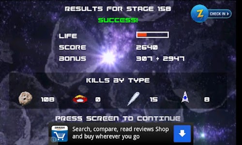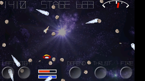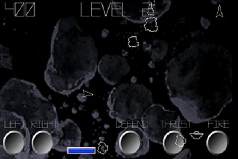 Defenses include the hyperspace that allows you to jump anywhere on the screen by touching the screen, the cloak allows you to pass harmlessly through enemies, armor which allows you to take half damage while active and the shield which causes enemies to bounce of you.