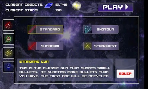 Weapons include the traditional gun that fires single shots, the Sunbeam that fires a laser that penetrates everything it hits, the Shotgun that fires a spread of bullets and the Starburst that explodes taking out many enemies at a time.