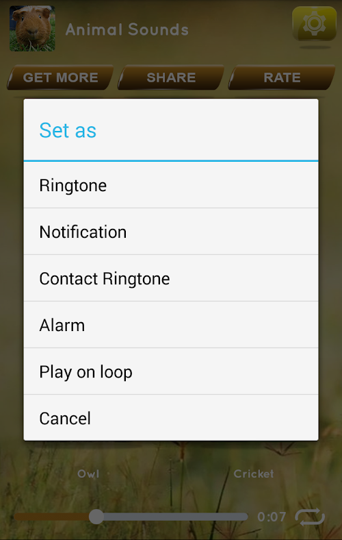 -New screen to set the sounds as ringtone, notification, contact ringtone or alarm (press and hold play to enter the screen);