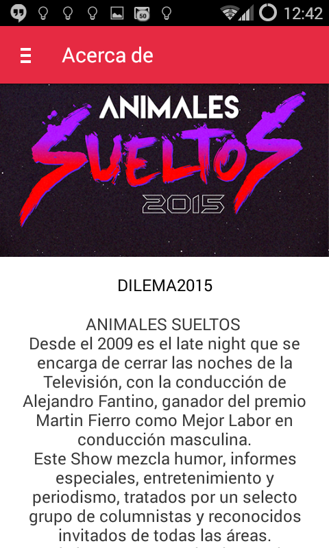 Sumate a los nuevos segmentos para definir el rumbo del programa participando en tiempo real del juego Dilema. Descárgate la app y divertite más que nunca mirando contenido exclusivo. Imágenes del backstage, cámaras ocultas, fotos y entrevistas. Vas a interactuar en vivo respondiendo trivias y enviando tus preguntas salvajes. Bienvenido a la segunda pantalla de Animales Sueltos. Sumate to new segments to define the direction of the program by participating in real time Dilemma game. Download the app and divertite more than ever looking exclusive content. Images backstage, hidden cameras, photos and interviews. You'll interact live answering trivia questions and sending your wild. Welcome to the second screen of Animals Loose.