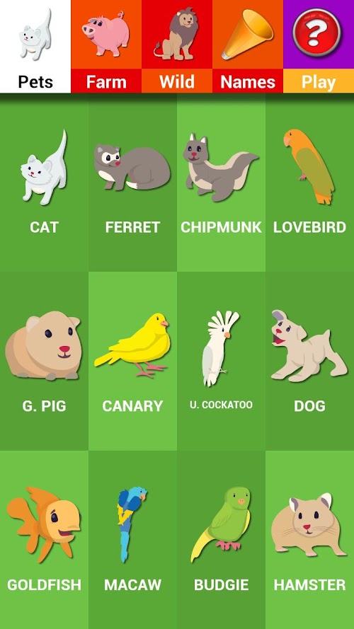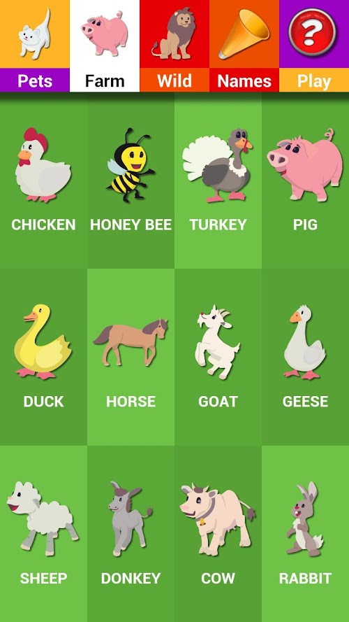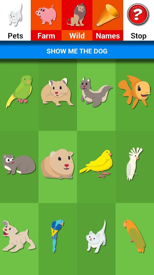 Play "Show me that animal" the game that make learning fun and easy for your kid. The animals are grouped in 3 categories Pets, Farm and Wild.