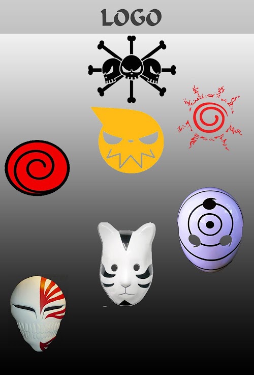 loads of logo and mask of popular ANIME like a NARUTO, DRAGON BALL, BLEACH, FAIRYTAIL