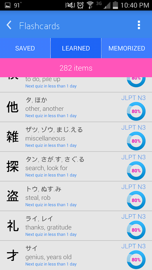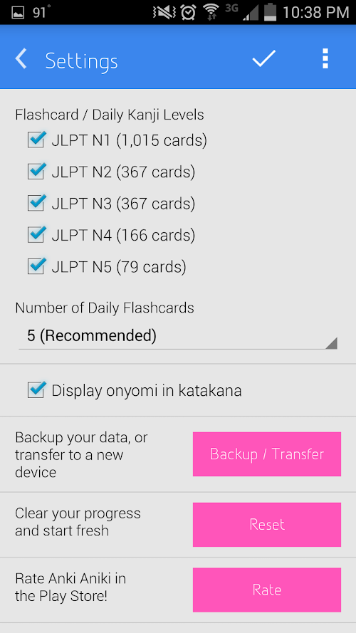 Learning takes time. Learning kanji (there are a lot of them) takes a long time. At minimum, it takes at least one and a half months for Anki Aniki to mark a learned item as memorized. To memorize all of the kanji in Anki Aniki it can take as little as 150 days or as much as 2 years depending on your ability and your ambition. Don’t let the numbers discourage you, though. It’s not a race. The main goal is retention.