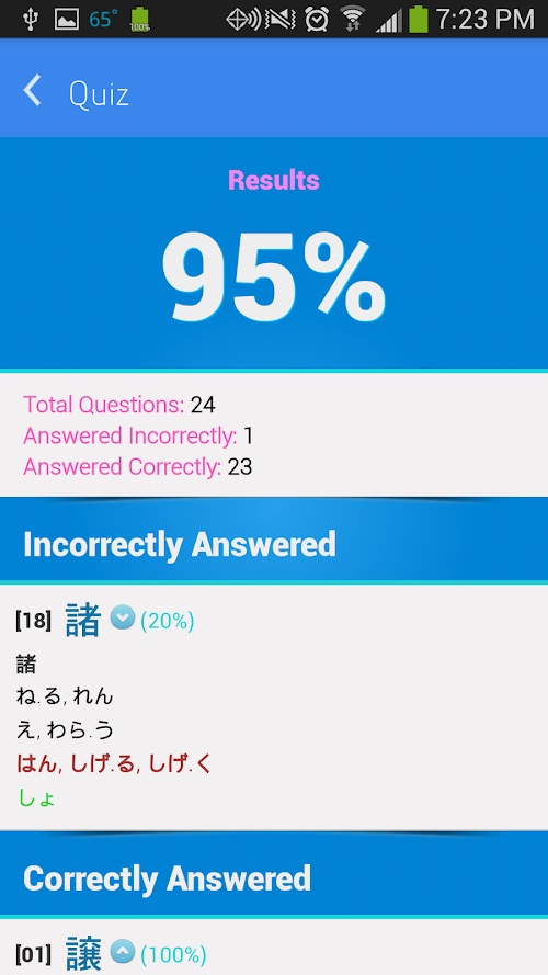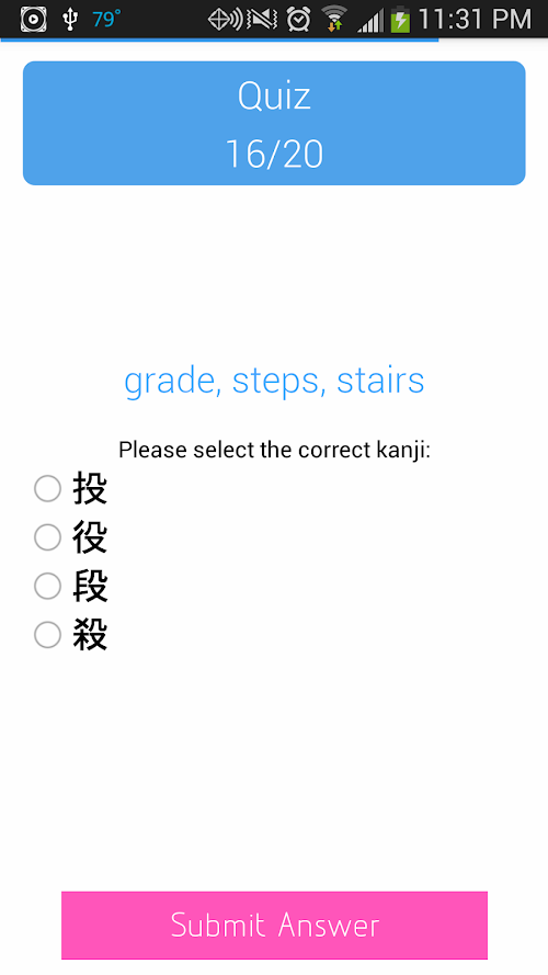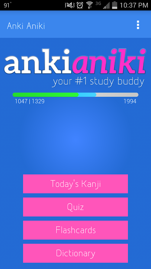 Anki Aniki uses a Spaced Repetition System (SRS) to train your brain into memorizing kanji on a long-term level. Each day, you will learn 5 to 20 new kanji which you will be quizzed on. If you answer incorrectly for an item, it will show up sooner on a following quiz. Conversely, if you answer correctly on an item it will be longer before you see it again. The more you answer an item correctly without getting it wrong, the less frequently it will appear - until you have it completely memorized.