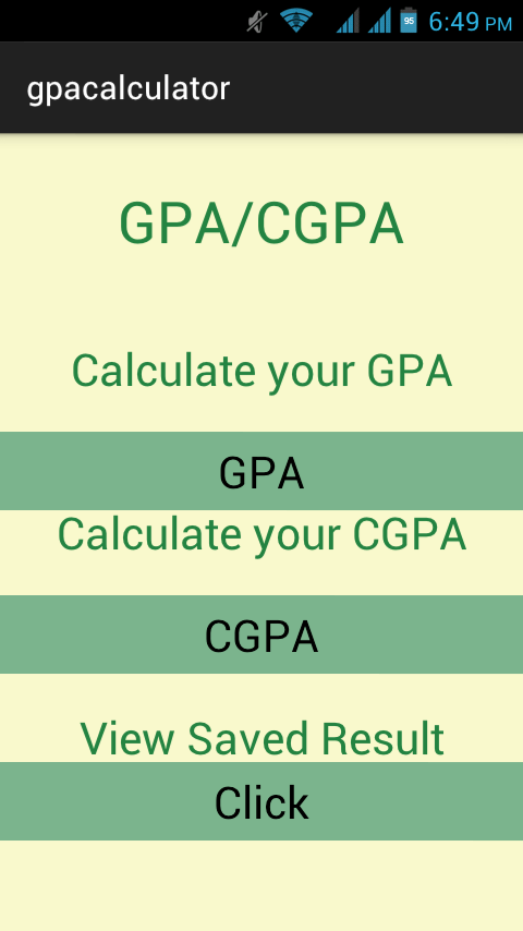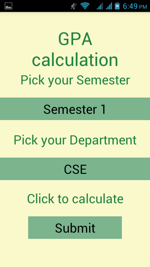 Calculate your GPA and CGPA at a click of a button. No net connectivity needed. You needn't know anything apart from your branch and regulation. Store your calculated results in the app and view it anytime later. No repeating the same calculations. Currently covers Anna University affiliated colleges, ECE, EEE, CSE,IT, Civil and Mechanical departments. Option for other departments to calculate after entering credits for the subjects.