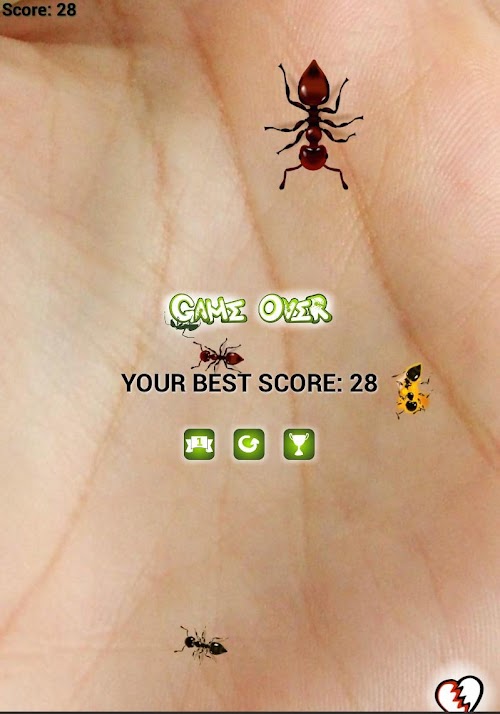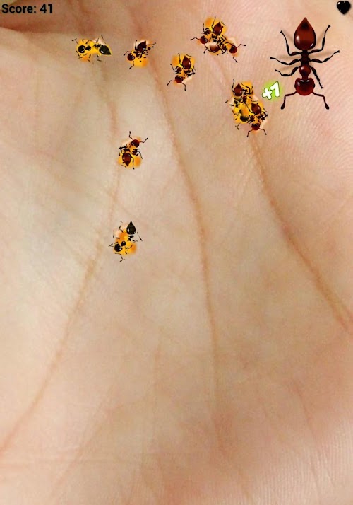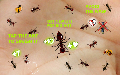 * Regular ants - of various colours and species. They die after one hit. Tap them with your finger before the reach the bottom of the screen. You will get additional risk bonus for regular ant: 1, 2 or 3 points, depending on how close to bottom of the screen the ant is.