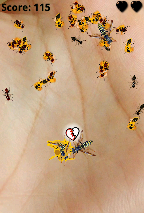 * Mutant ants - of various colours, species and sizes. They require many taps to kill. Each will restore one of your lost lives. However, if you let even a single mutant ant to cross the screen, you loose the whole game immediately.