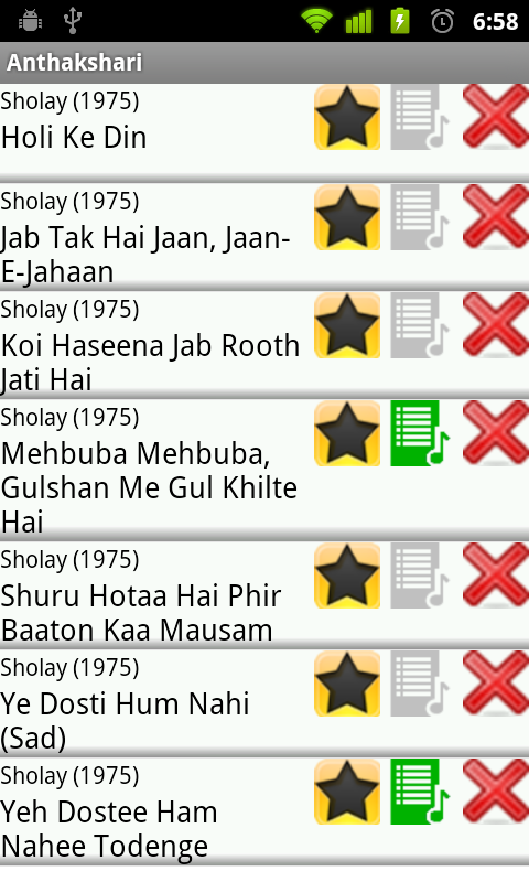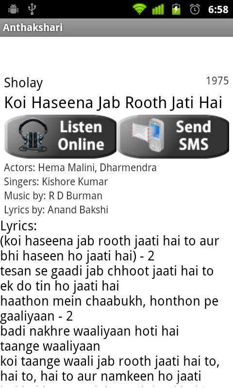 Anthakshari is designed and developed by Nava Apps. As the name suggests, this is an app where you can look up the lyrics of the hindi movie songs that start with any syllable (or staring letter) you desire. The app is designed to help you play the game with your family and friends. You can search any song anytime on your phone now based on the name of the movie or actors and actresses or singers or music directors or lyricist. Simple to use and easy to understand, this app is a cool addition to your smartphone. This is VERSION 2.0. If you have any suggestions, please leave a comment and we will try and incorporate them into the next version update.