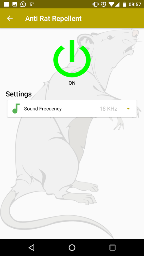 2.- In the tool, which emits mouse repellent sounds you can choose the rodent repellent sound frequency you want the app to emit. You have many possibilities, from 8KHz to 22 KHz. Once you have chosen one, you only have to push the button On. To stop playing the rat killer sound youll have to push the same button again. You should know that the aim of this tool is to scare those animals away, this tool wont help you to kill or eliminate rats nor work as rat poison or mouse poison.