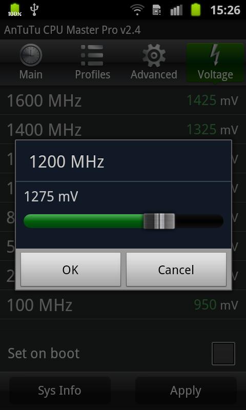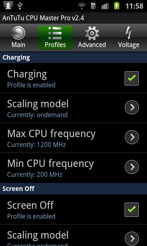 CPU Master also allows you to set up profiles to change the CPU speed under certain conditions, such as when the phone is asleep or charging, when the battery level drops below a certain point, or when the phone's temperature is too high.
