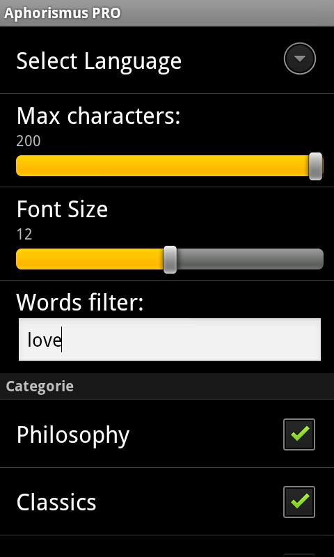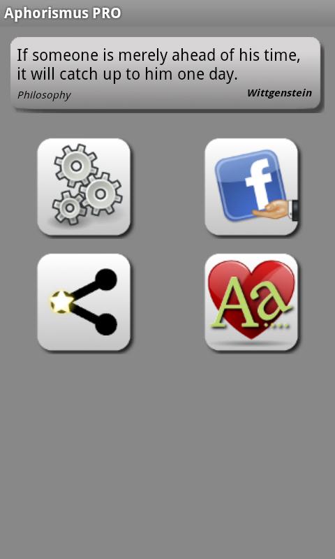 Aphorismus! A Widget and Application with more than 5000 quotations and aphorisms sorted by categories like literature, philosophy, movies, comedy and many others, with forward SMS, publish on Facebook wall and search function.