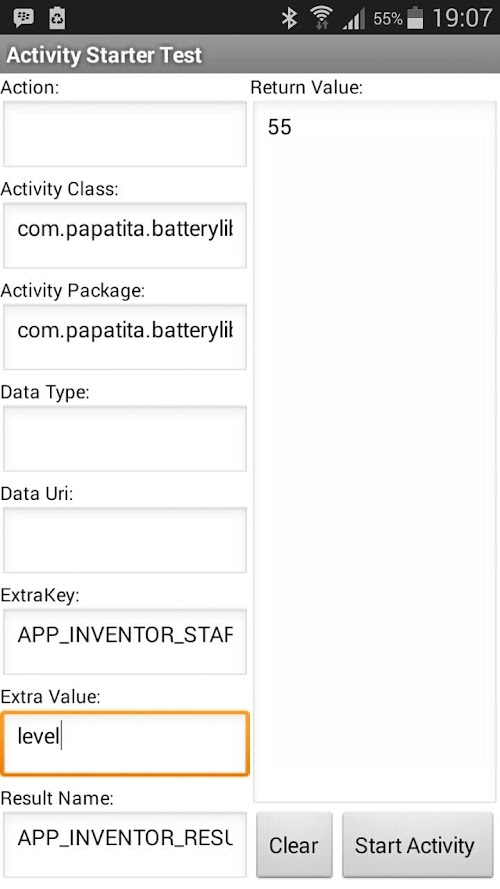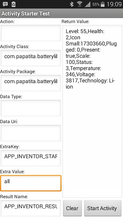 Cara pemakaiannya adalah dengan memanggilnya dengan menggunakan Activity Starter di App Inventor, parameter yang dimasukkan didalam Activity Starter adalah: