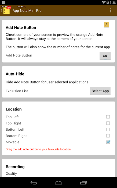 App Note Mini help your to create and organize your notes for different apps. You can also use it as a to-do list for different applications. You can type your notes, or record a voice notes. It provide a add note button, which is always appear at the corner of your phone, so that you can add notes for different apps easily. You can also treat it as an organizer for your apps.