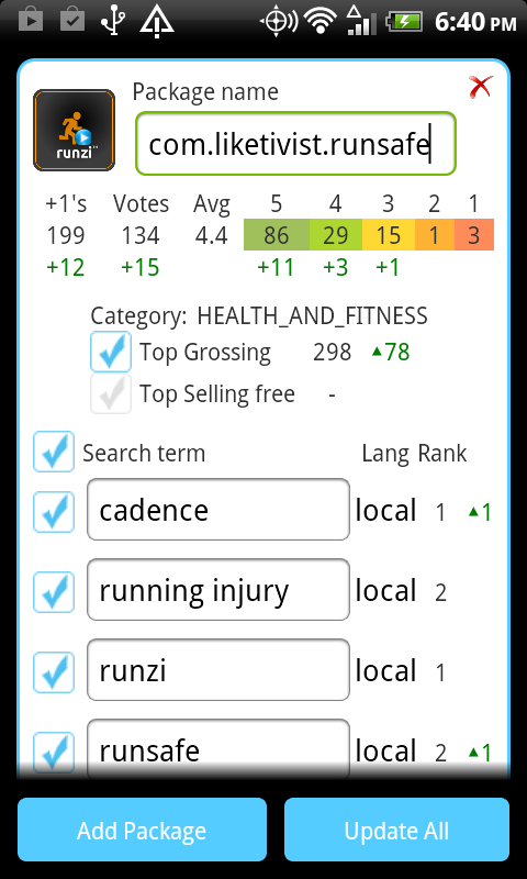 AppWatch is an App Store Optimization (ASO) / App Search Engine Optimization (App SEO) / SERP tracker app. It allows an Android developer to quickly track their app's rank in the Google Play search results for up to three keyword searches. Simply enter your Google Play app's package name (e.g. com.example.myapp) and the keywords that you would like for your app to appear. You will get the rank position of your app within the list of all apps returned for those search keywords on the Google Play market.