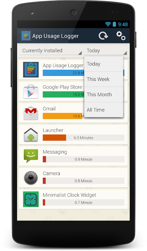 • View apps usage in a certain time frame (today, this week, this month, all time).