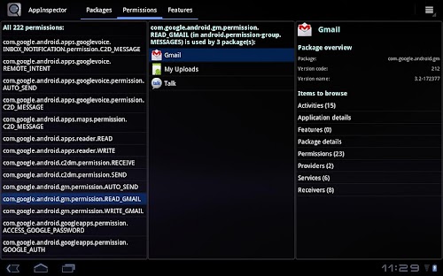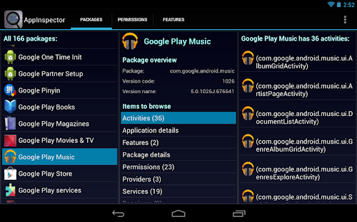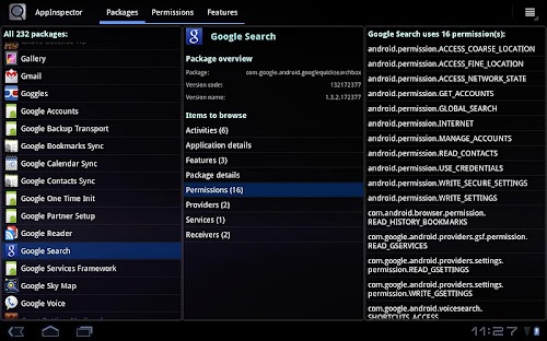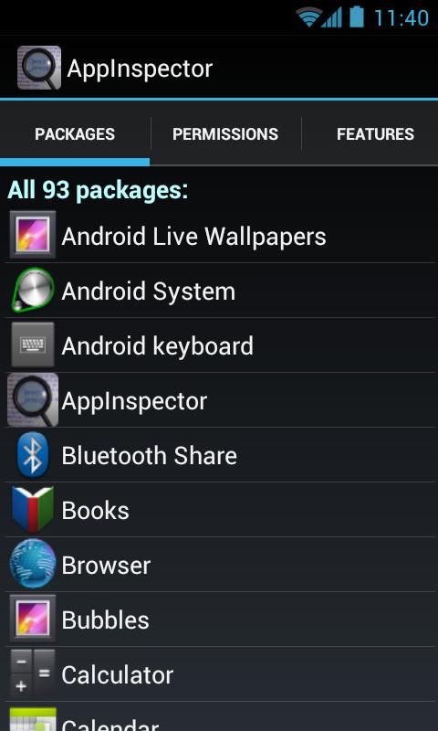 AppInspector is a tool to help you explore the applications installed on your device. Using information from the package manifest for each app, key information is presented including: overall package and application information, permissions used, features required, as well as any activities, services, providers and receivers defined. In addition to browsing by application, AppInspector also makes it easy to quickly browse all installed apps that either require a specific permission or feature.
