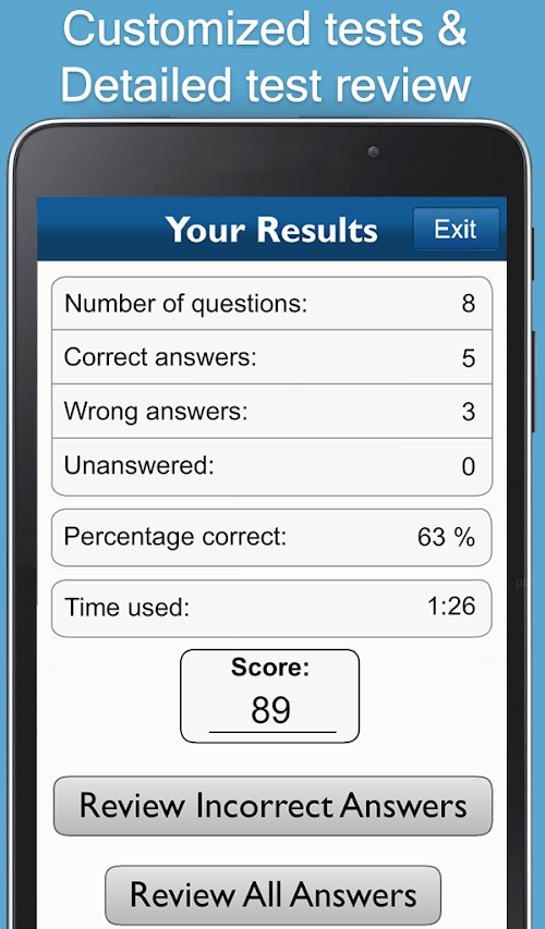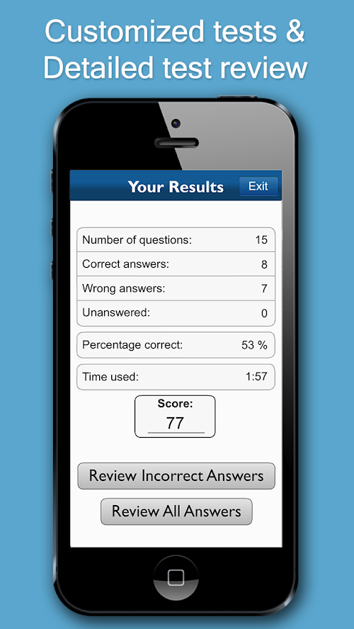 After each practice session your results with score are displayed, you can review questions and read a detailed explanation of almost every answer.
