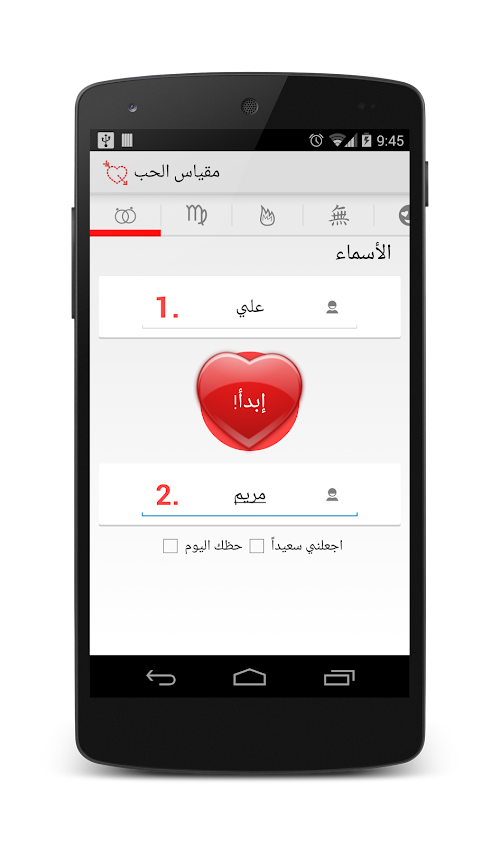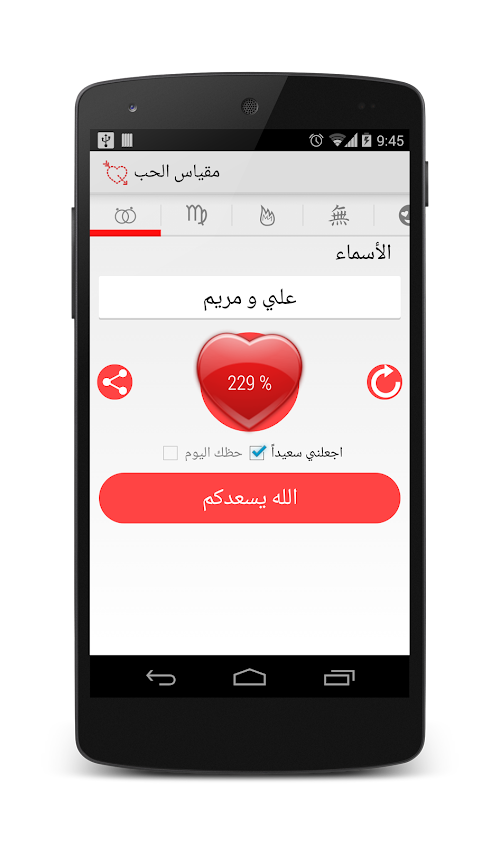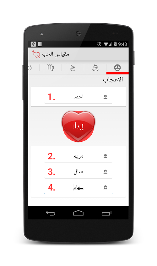To use, just fill in the names (Arabic or English) and click on the HEART to calculate and get your match percentage.