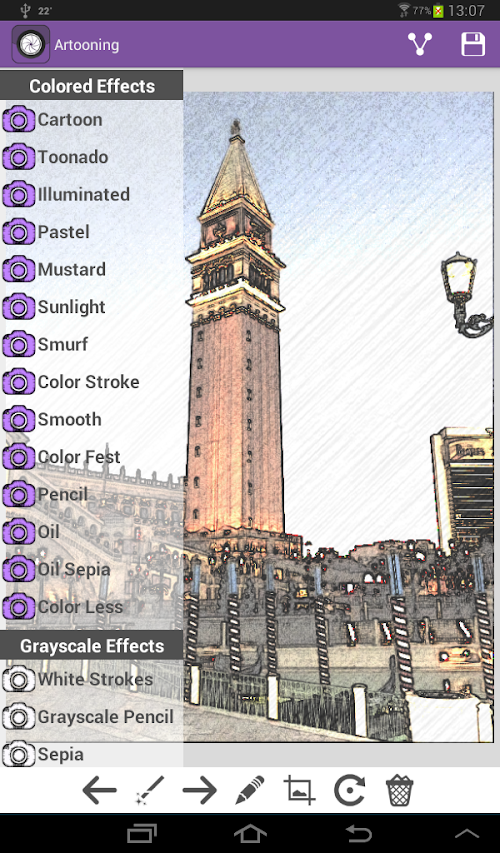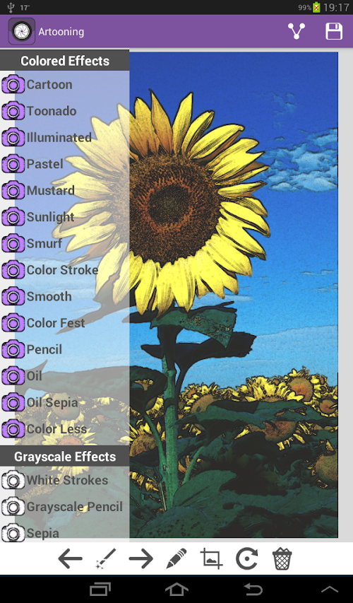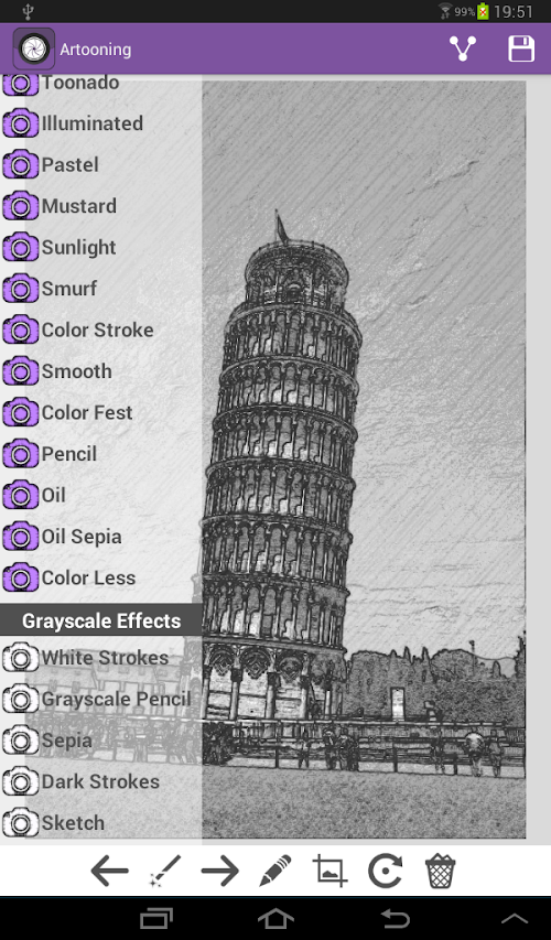 Artooning offers a large variety of effects for your photos including cartoon, pastel, color stroke, pencil, oil, white strokes, sepia, gray-scale, sketch and more. It helps you to edit and modify your images with cool effects!